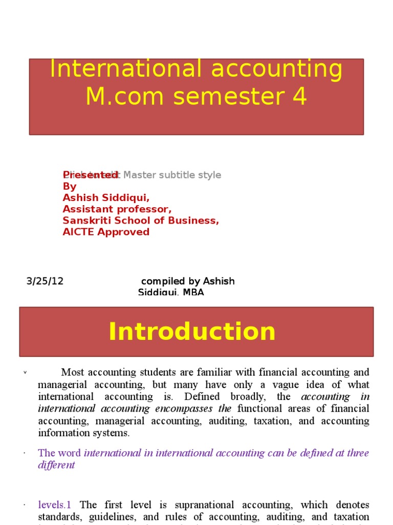 International accounting ppt. Ad Find International Accounting. Compiled by Ashish Introduction v. Accounting and Finance in the International Business is the property of its rightful owner.